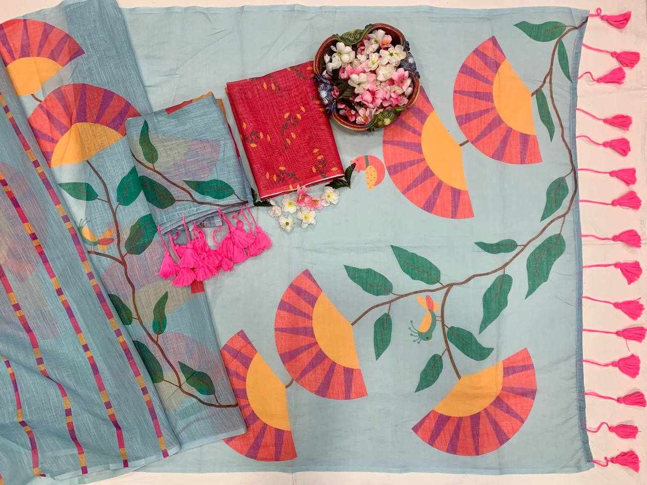 Saree Fabric: Premium Linen Cotton with beautiful digital print and elegant handmade cotton tassels