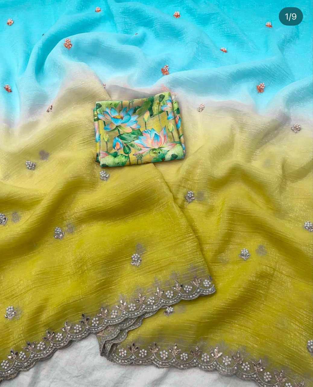 Fabric:- Candy Crush Silk With Beautiful Embroidery& Moti Work Scalloped Cut work Border
